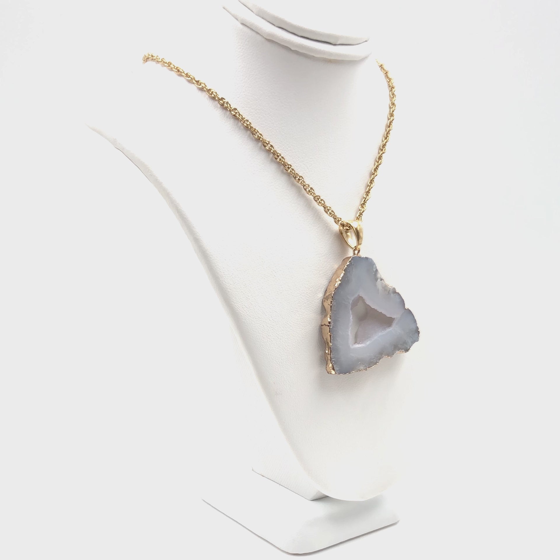 Gold And White Dangle Hypoallergenic Nickel Free Statement Pendant Necklace. Custom Agate Slices Raw Natural Stone Accents And Designed With Love In Texas. Size 18, 22, or 32 Inch Length, Plus 3 Inch Attached Necklace Extender With Custom Sizing Available On Select Pieces.