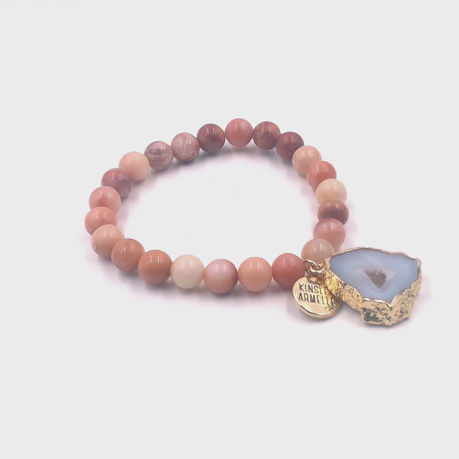 Gold And Pink Charm Dangle Glossy Hypoallergenic Nickel Free Beaded Stretch Bracelet. Custom Agate Slices Raw Natural Stone Accents And Designed With Love In Texas. Size Small, Medium, Large, and Extra Large Ranging From 6.25 - 7.25 Inch Circumference With Custom Sizing Available On Select Pieces.