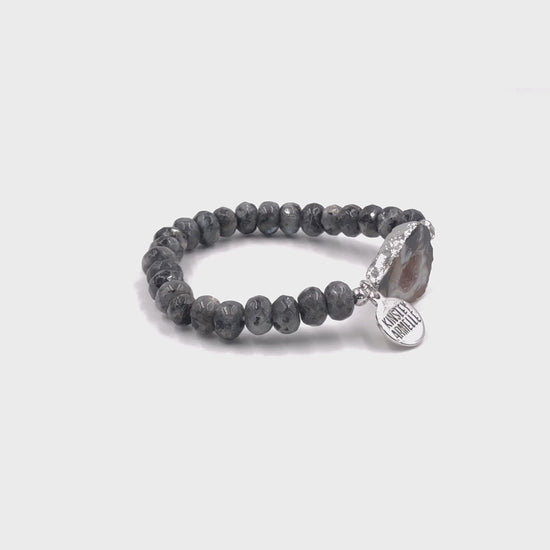 Silver And Black Faceted Gray Hypoallergenic Nickel Free Beaded Stretch Bracelet. Custom Agate Slices Raw Natural Stone Accents And Designed With Love In Texas. Size Small, Medium, Large, and Extra Large Ranging From 6.25 - 7.25 Inch Circumference With Custom Sizing Available On Select Pieces.