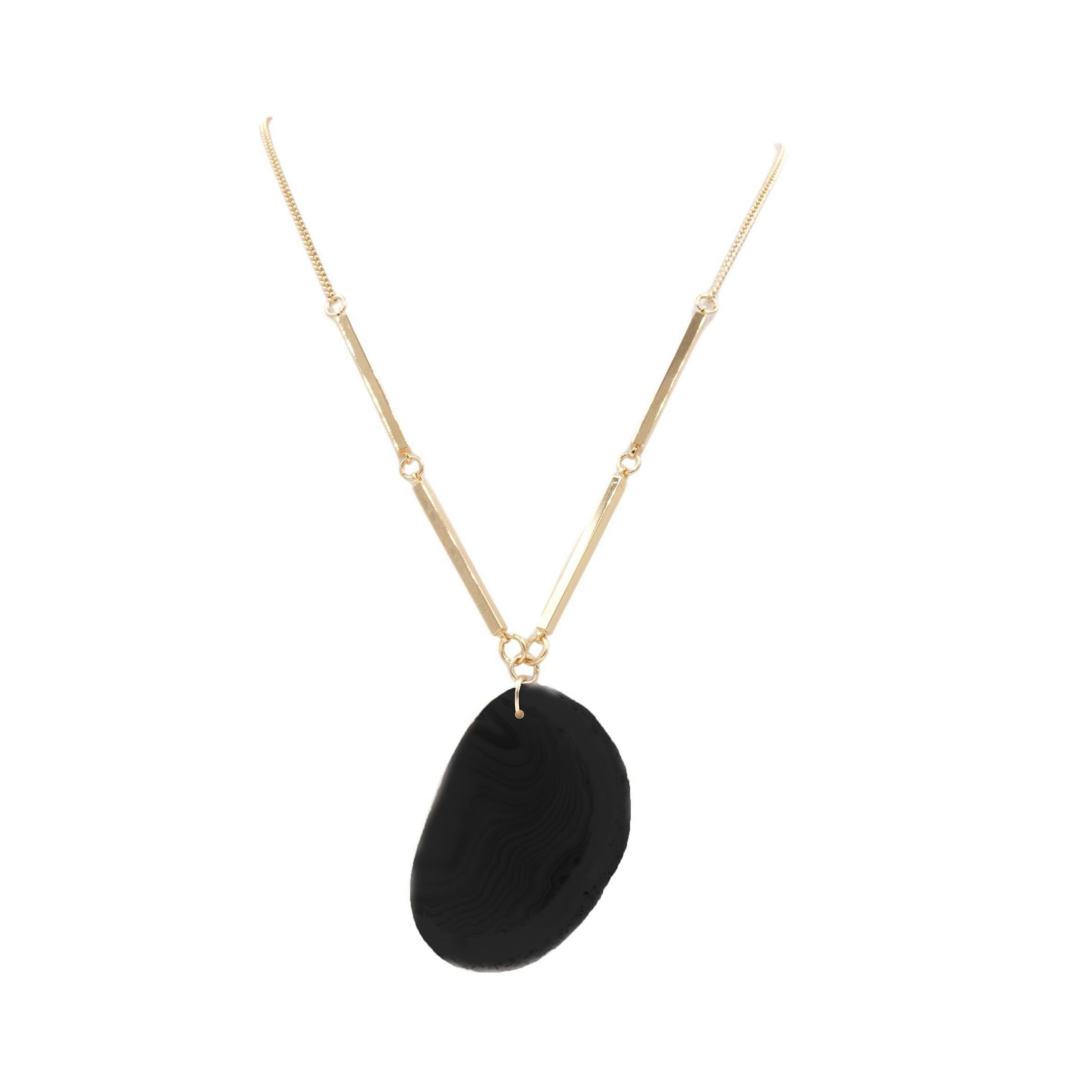 Gold And Black Dangle Hypoallergenic Nickel Free Statement Pendant Necklace. Custom Agate Slices Raw Natural Stone Accents And Designed With Love In Texas. Size 18, 22 or 32 Inch Length, Plus 3 Inch Attached Necklace Extender With Custom Sizing Available On Select Pieces.