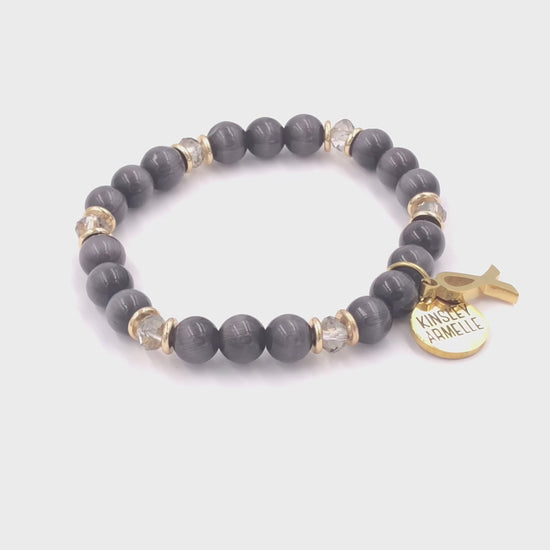 Gold And Gray Awareness Pledge Hypoallergenic Nickel Free Beaded Stretch Bracelet. Custom 18K Yellow Gold Ion Plated Stainless Steel Charm Accents And Designed With Love In Texas. Size Small, Medium, Large, and Extra Large Ranging From 6.25 - 7.25 Inch Circumference With Custom Sizing Available On Select Pieces.