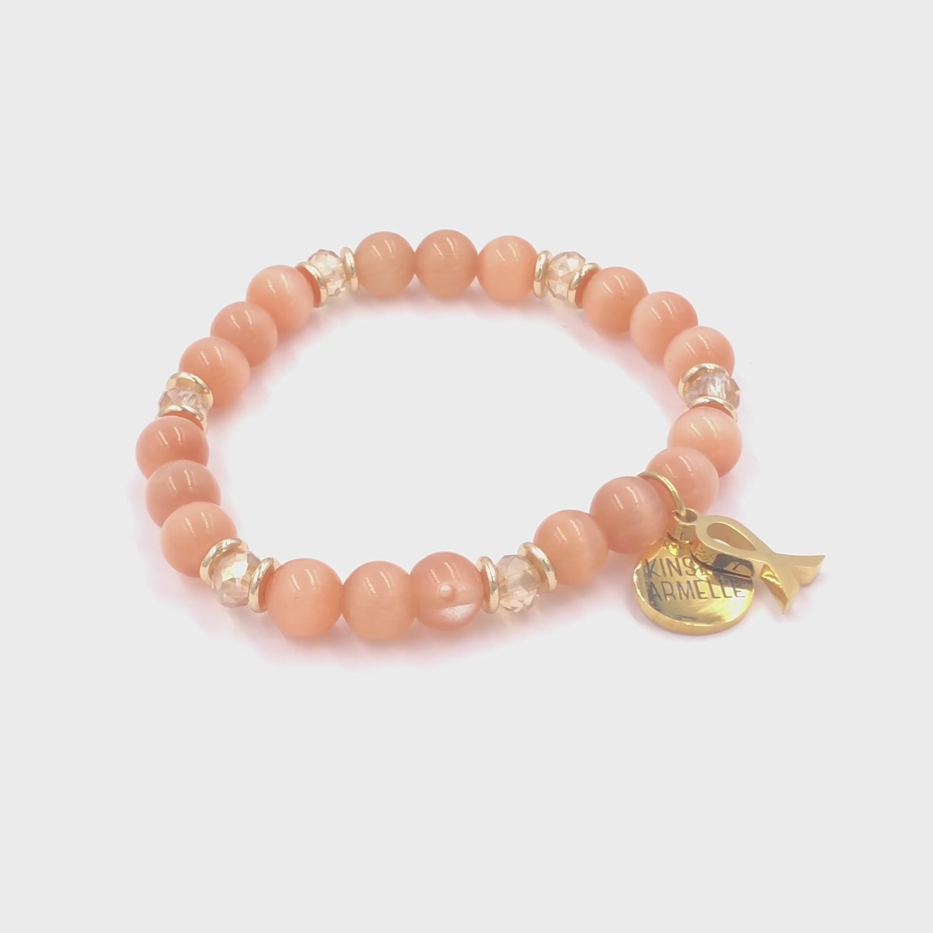 Gold And Orange Awareness Pledge Hypoallergenic Nickel Free Beaded Stretch Bracelet. Custom 18K Yellow Gold Ion Plated Stainless Steel Charm Accents And Designed With Love In Texas. Size Small, Medium, Large, and Extra Large Ranging From 6.25 - 7.25 Inch Circumference With Custom Sizing Available On Select Pieces.