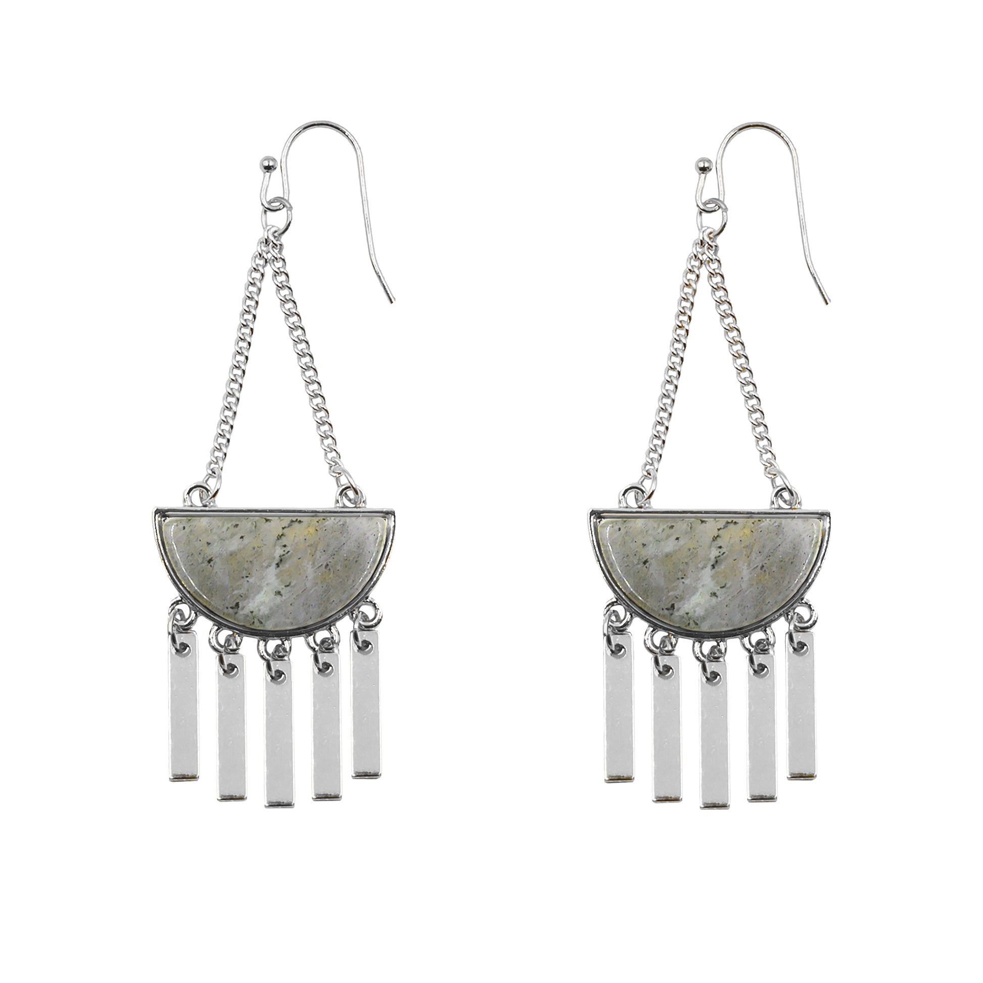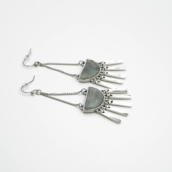 Silver And Green Aztec Bar Fringe Tassel Mediumweight Hypoallergenic Nickel Free Statement Drop Earrings. Custom Labradorite Raw Natural Stone Accents And Designed With Love In Texas. Size 3 Inch Length x 1 Inch Width With Custom Sizing Available On Select Pieces.