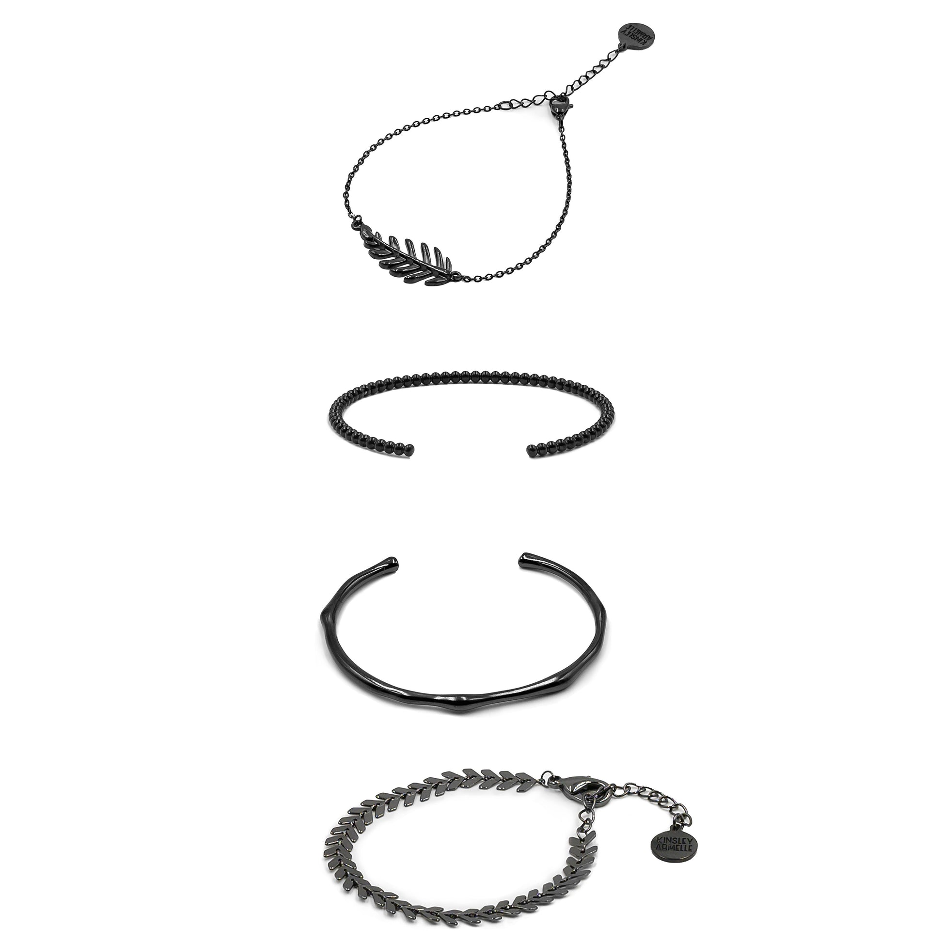 All Black Adjustable Leaf Feather Stackable Hypoallergenic Nickel Free Bracelet Stack Set. Custom Black Ion Plated Stainless Steel Geometric Shapes Accents And Designed With Love In Texas. Size Small, Medium, Large, and Extra Large Ranging From 6.25 - 7.25 Inch Circumference With Custom Sizing Available On Select Pieces.