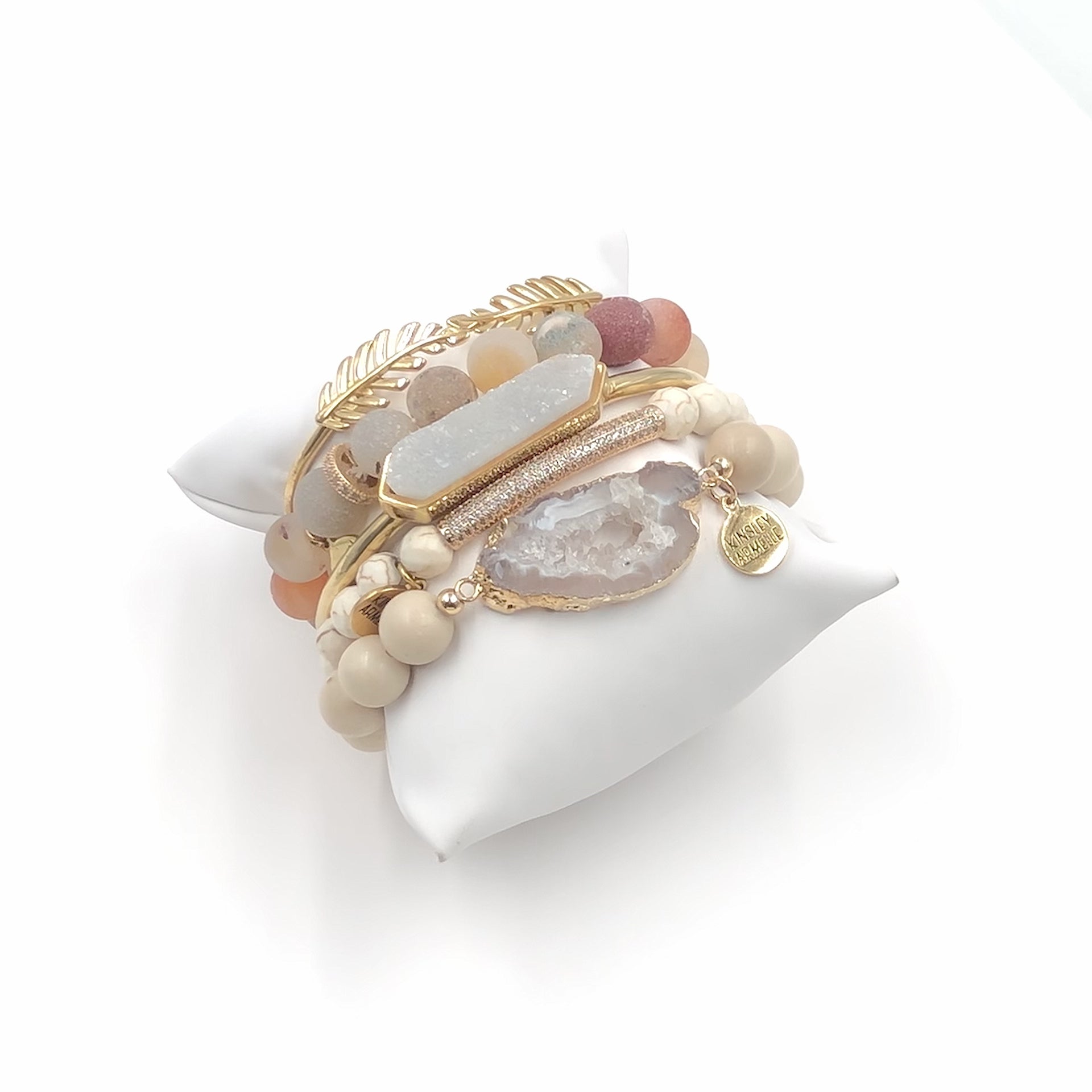 Gold And Brown Agate Slices Beads Boho Cuff Druzy Leaf Feather Pave Raw Stackable Hypoallergenic Nickel Free Bracelet Stack Set. Custom Druzy Raw Natural Quartz Stone Accents And Designed With Love In Texas. Size Small, Medium, Large, and Extra Large Ranging From 6.25 - 7.25 Inch Circumference With Custom Sizing Available On Select Pieces.