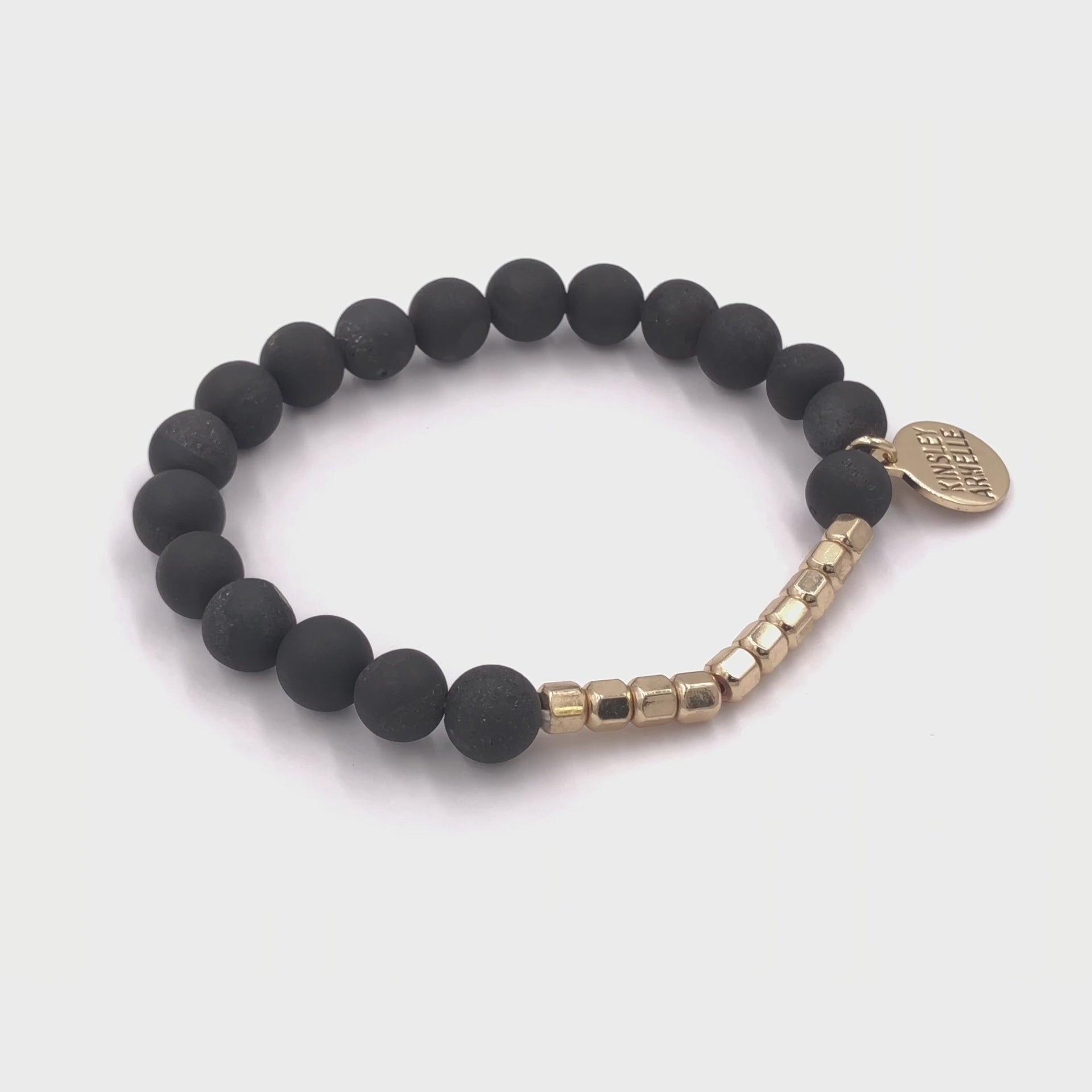 Gold And Black Druzy Faceted Geode Pocks Hypoallergenic Nickel Free Beaded Stretch Bracelet. Custom Decorative Accent Beads Accents And Designed With Love In Texas. Size Small, Medium, Large, and Extra Large Ranging From 6.25 - 7.25 Inch Circumference With Custom Sizing Available On Select Pieces.