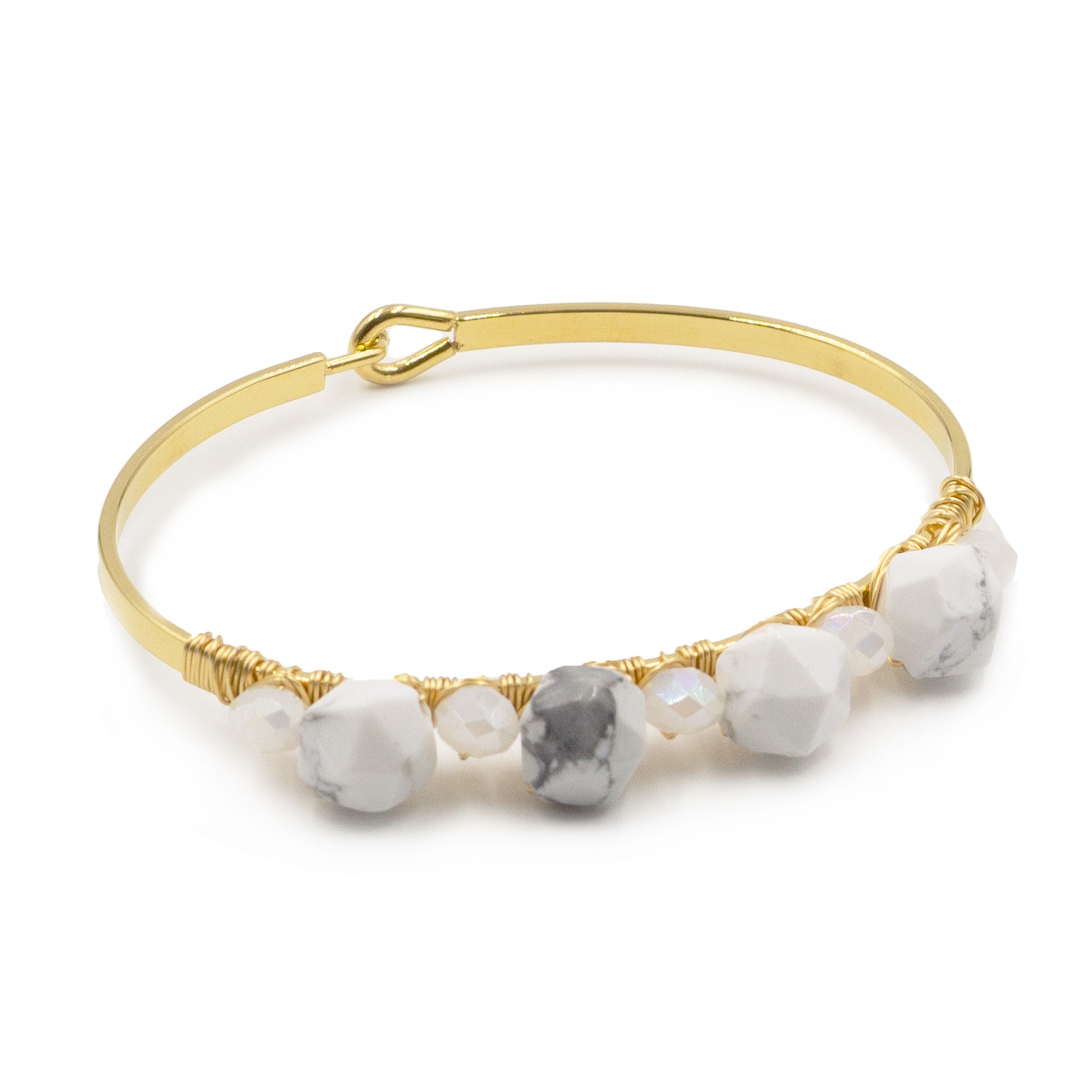 Gold And White Chip Jagged Marble Natural Stone Wire Wrapped Hypoallergenic Nickel Free Bangle Cuff Bracelet. Custom Howlite Raw Natural Stone Accents And Designed With Love In Texas. Size 6.25 -7.25 Inch Circumference With Custom Sizing Available On Select Pieces.