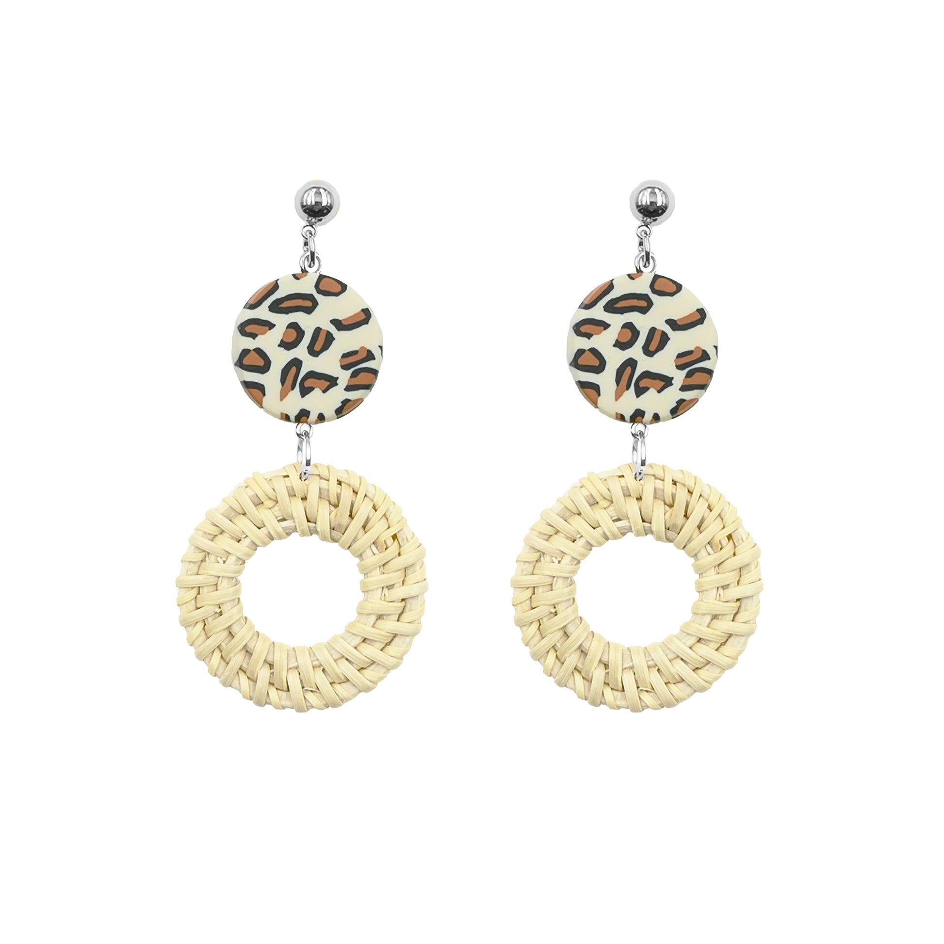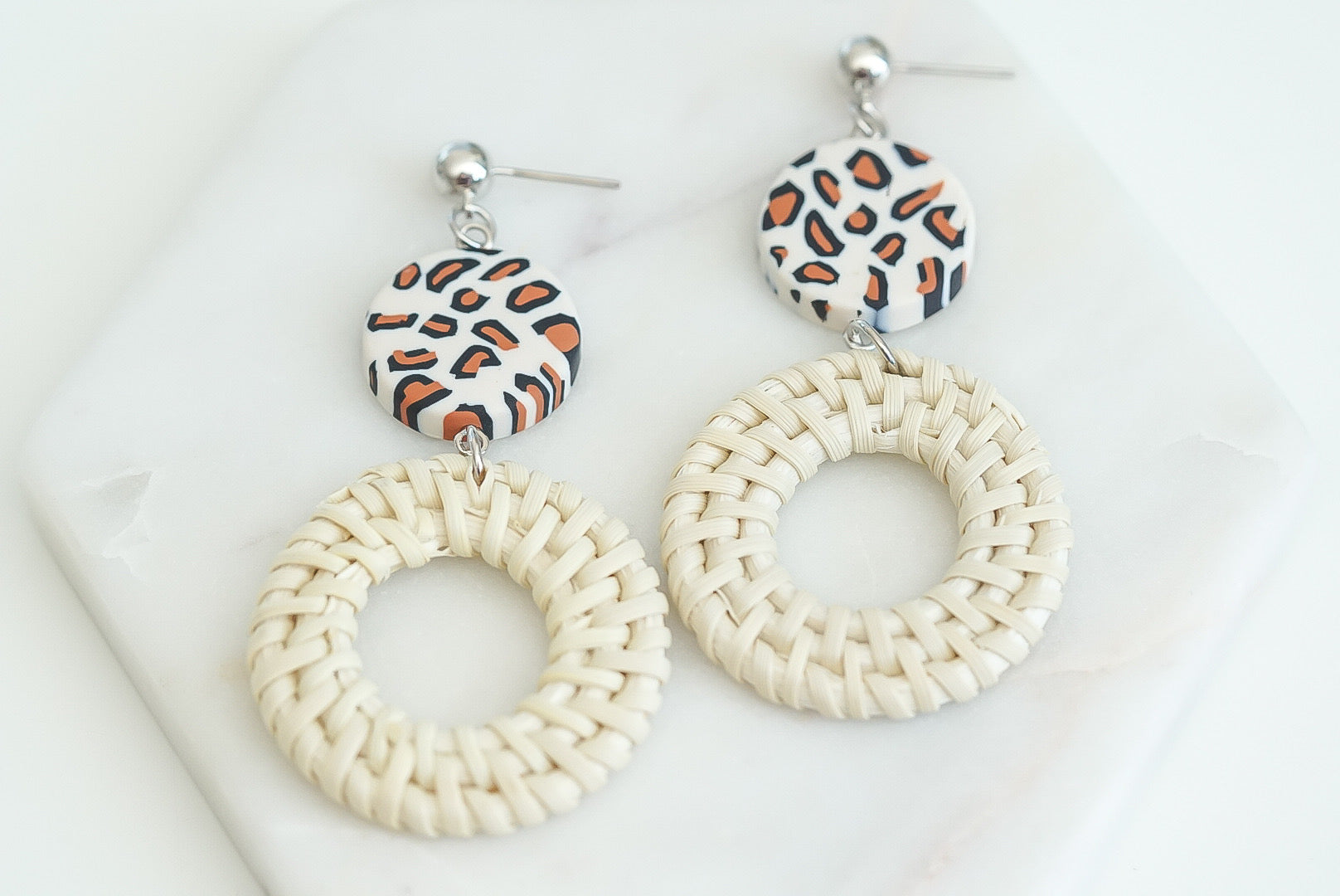 Silver And Brown Bamboo Cheetah Clay Leopard Rafia Straw Stud Tiered Woven Featherweight Hypoallergenic Nickel Free Statement Drop Earrings. Custom Straw Geometric Shapes Accents And Designed With Love In Texas. Size 2.75 Inch Length x 1.25 Inch Width With Custom Sizing Available On Select Pieces.