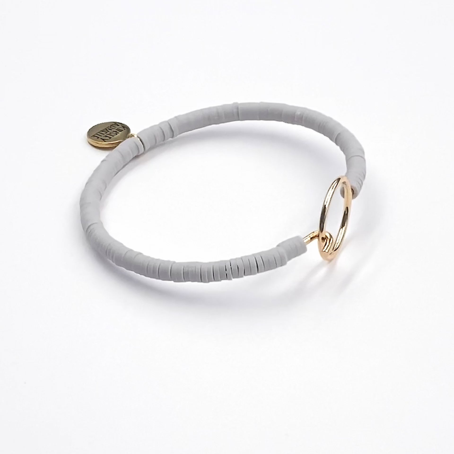 Gold And Gray Circle Disc Heishi Hypoallergenic Nickel Free Bangle Cuff Bracelet. Custom 18K Yellow Gold Ion Plated Stainless Steel Geometric Shapes Accents And Designed With Love In Texas. Size Small, Medium, Large, and Extra Large Ranging From 6.25 - 7.25 Inch Circumference With Custom Sizing Available On Select Pieces.