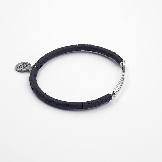 Silver And Black Disc Heishi Hypoallergenic Nickel Free Bangle Cuff Bracelet. Custom Silver Ion Plated Stainless Steel Geometric Shapes Accents And Designed With Love In Texas. Size Small, Medium, Large, and Extra Large Ranging From 6.25 - 7.25 Inch Circumference With Custom Sizing Available On Select Pieces.