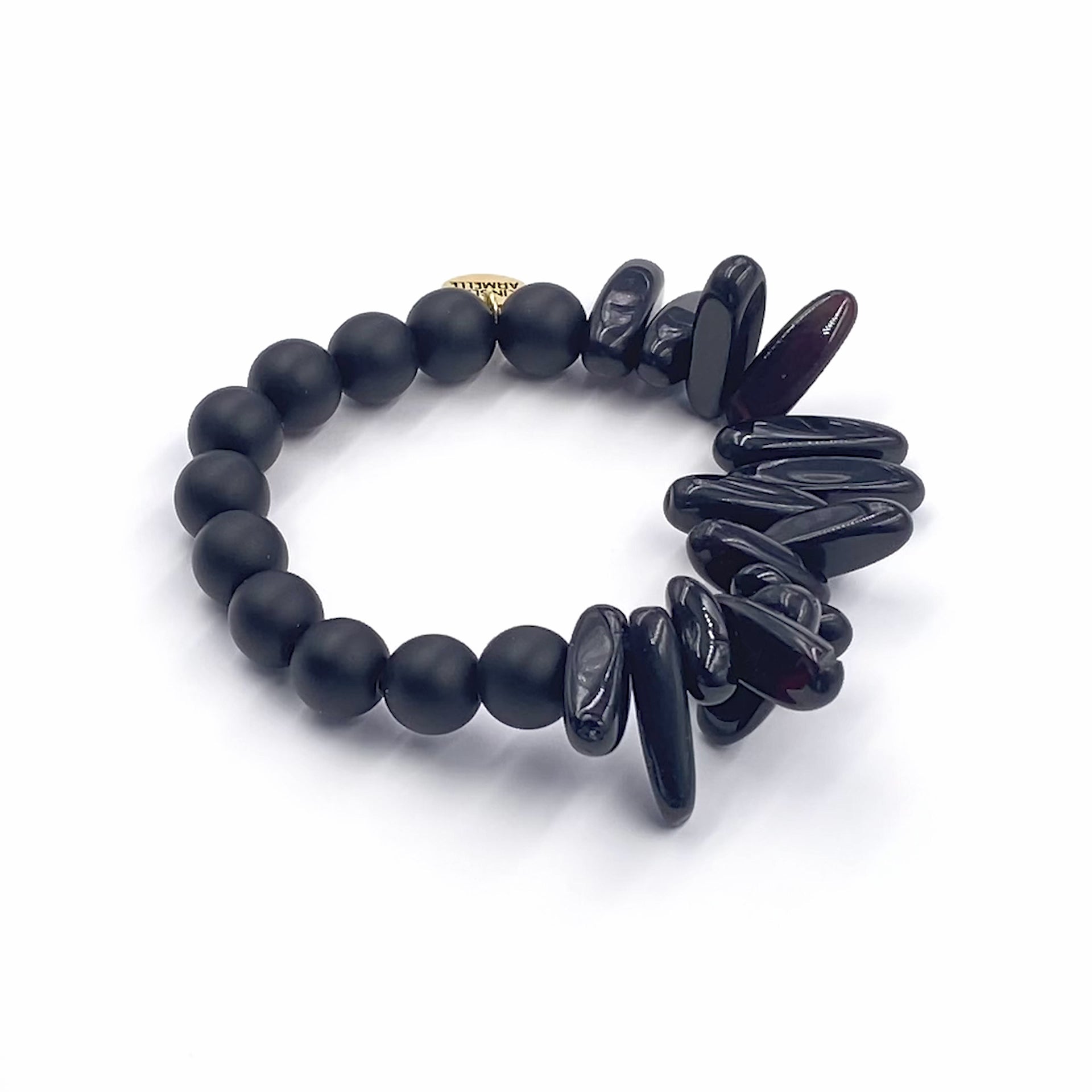 Gold And Black Chip Chunky Hypoallergenic Nickel Free Statement Beaded Stretch Bracelet. Custom 18K Yellow Gold Ion Plated Stainless Steel Charm Accents And Designed With Love In Texas. Size Small, Medium, Large, and Extra Large Ranging From 6.25 - 7.25 Inch Circumference With Custom Sizing Available On Select Pieces.