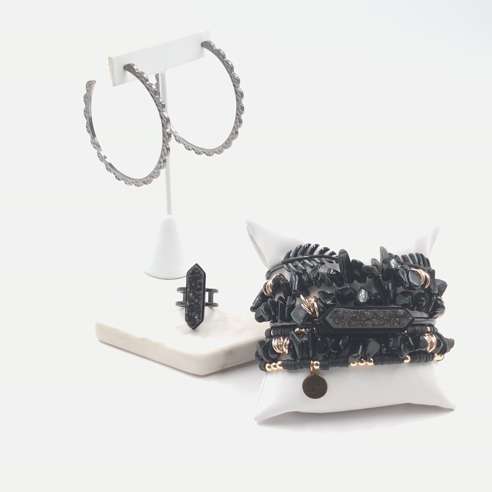 All Black Chip Chunky Cuff Disc Earrings Leaf Feather Hypoallergenic Nickel Free Jewelry & Bracelet Stack Set. Custom Druzy Raw Natural Quartz Stone Accents And Designed With Love In Texas. Size Small, Medium, Large, and Extra Large Ranging From 6.25 - 7.25 Inch Circumference With Custom Sizing Available On Select Pieces.
