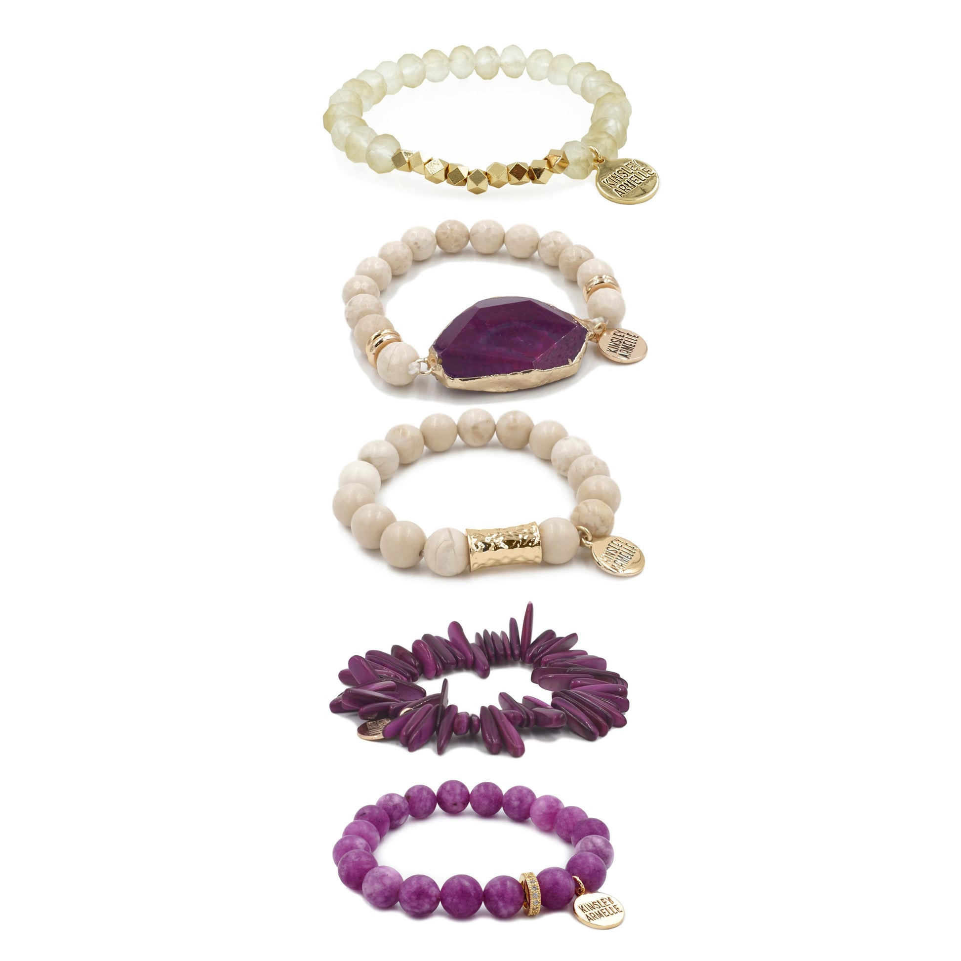 Gold And Purple Beads Chip Chunky Stackable Tan Hypoallergenic Nickel Free Bracelet Stack Set. Custom Agate Raw Natural Stone Accents And Designed With Love In Texas. Size Small, Medium, Large, and Extra Large Ranging From 6.25 - 7.25 Inch Circumference With Custom Sizing Available On Select Pieces.