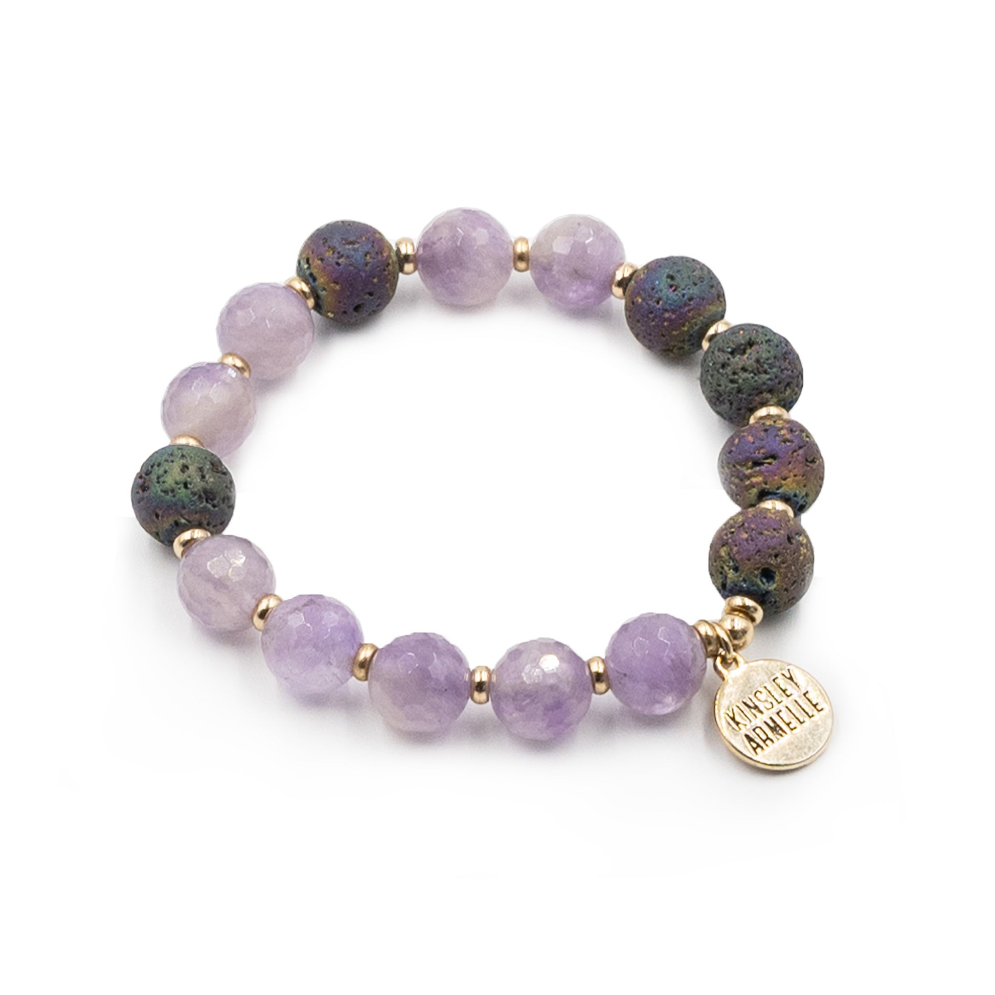 Gold And Purple Asymmetrical Multicolored Hypoallergenic Nickel Free Beaded Stretch Bracelet. Custom Lava Rock Raw Natural Stone Accents And Designed With Love In Texas. Size Small, Medium, Large, and Extra Large Ranging From 6.25 - 7.25 Inch Circumference With Custom Sizing Available On Select Pieces.