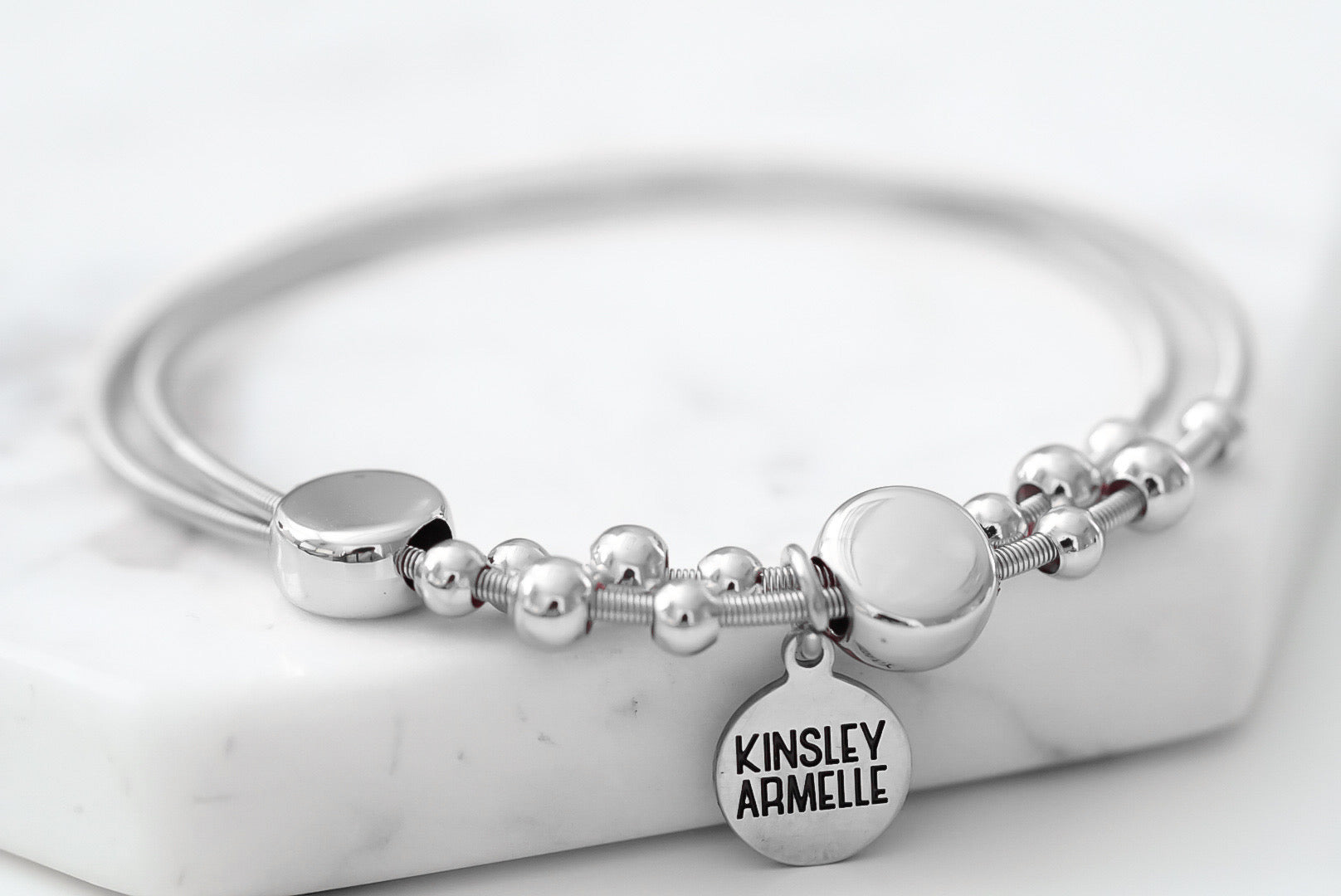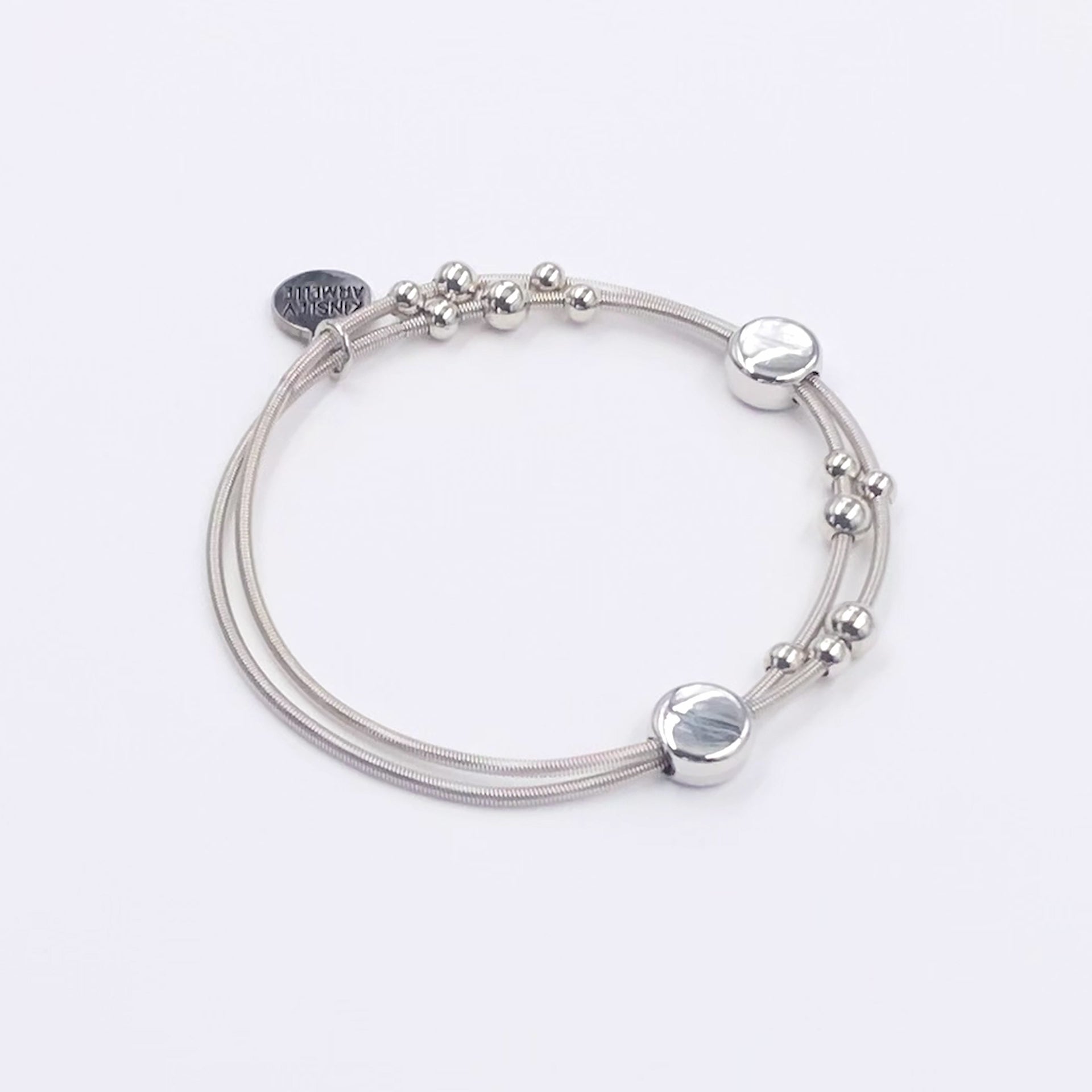 Silver And Gray Disc Hypoallergenic Nickel Free Dainty Steel Bracelet. Custom Decorative Accent Beads Accents And Designed With Love In Texas. Size Small, Medium, Large, and Extra Large Ranging From 6.25 - 7.25 Inch Circumference With Custom Sizing Available On Select Pieces.