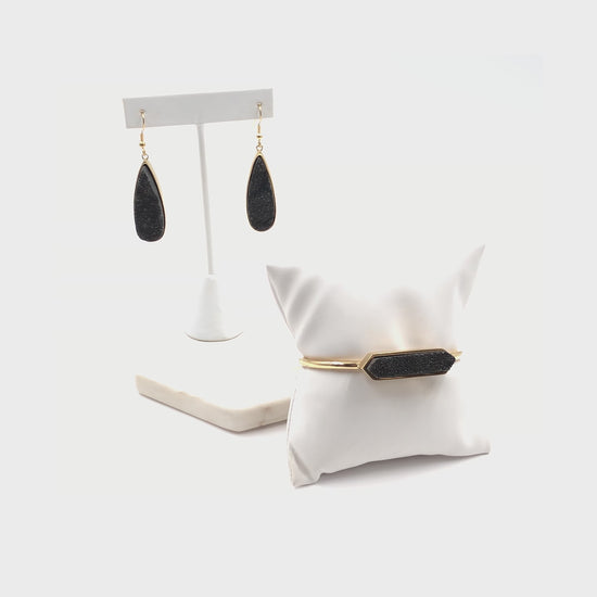 Gold And Black Druzy Matching Set Natural Stone Crystal Gemstone Raw Hypoallergenic Nickel Free Jewelry & Bracelet Stack Set. Custom Druzy Raw Natural Quartz Stone Accents And Designed With Love In Texas. Size Bracelet: 6.5 - 8 Inch Circumference | Earrings: 2.5 Inches Length x 0.5 Inches Width With Custom Sizing Available On Select Pieces.