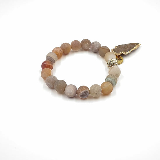 Gold And Brown Matte Hypoallergenic Nickel Free Beaded Stretch Bracelet. Custom Jasper Arrowhead Accents And Designed With Love In Texas. Size Small, Medium, Large, and Extra Large Ranging From 6.25 - 7.25 Inch Circumference With Custom Sizing Available On Select Pieces.