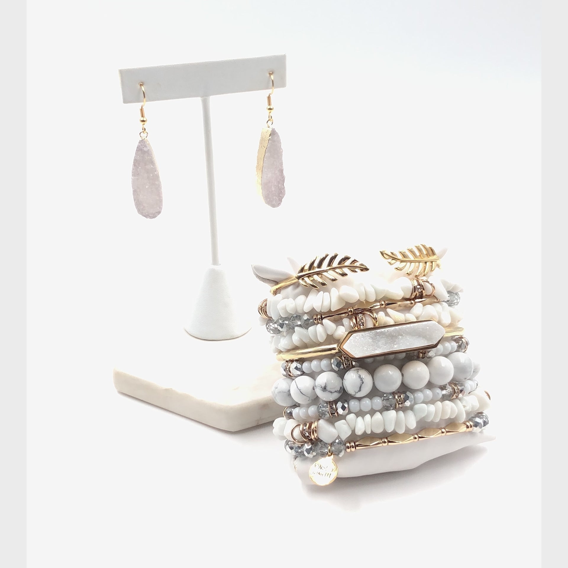 Gold And White Chip Chunky Dangle Earrings Multistrand Stackable Hypoallergenic Nickel Free Jewelry & Bracelet Stack Set. Custom Druzy Raw Natural Quartz Stone Accents And Designed With Love In Texas. Size Small, Medium, Large, and Extra Large Ranging From Bracelets: 6.25 - 7.25 Inch Circumference | Earrings: 1.75 Inch Length x 0.5 Inch Width With Custom Sizing Available On Select Pieces.
