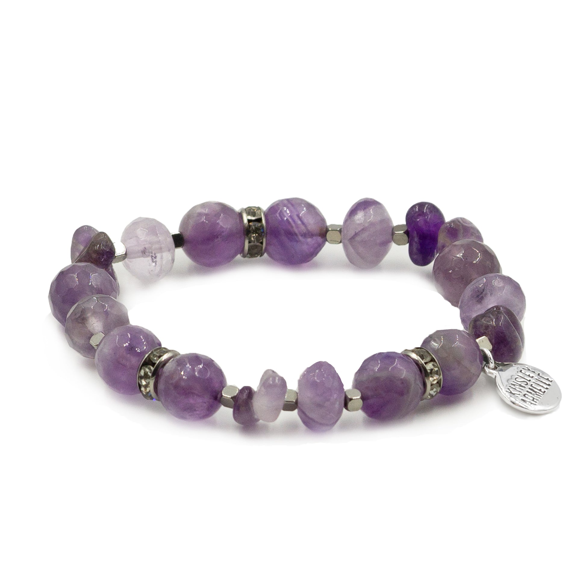 Silver And Purple Faceted Hypoallergenic Nickel Free Beaded Stretch Bracelet. Custom Silver Ion Plated Stainless Steel Decorative Accent Beads Accents And Designed With Love In Texas. Size Small, Medium, Large, and Extra Large Ranging From 6.25 - 7.25 Inch Circumference With Custom Sizing Available On Select Pieces.