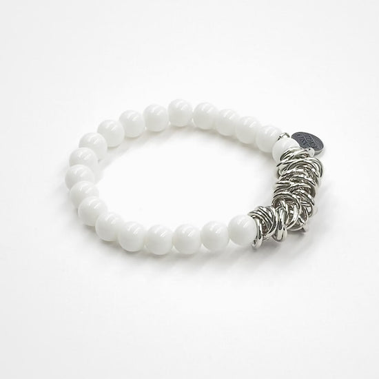 Silver And White Chain Clustered Hypoallergenic Nickel Free Beaded Stretch Bracelet. Custom Decorative Accent Beads Accents And Designed With Love In Texas. Size Small, Medium, Large, and Extra Large Ranging From 6.25 - 7.25 Inch Circumference With Custom Sizing Available On Select Pieces.
