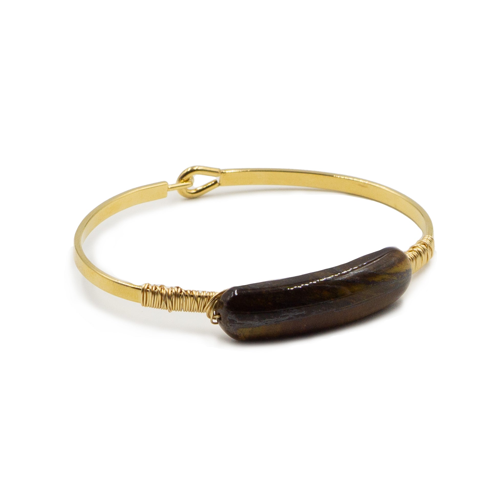 Gold And Brown Beads Wire Wrapped Bangle Cuff Bracelet. Custom Tiger Stone Raw Natural Stone Accents And Designed With Love In Texas. Size Small, Medium, Large, and Extra Large Ranging From 6.25 - 7.25 Inch Circumference With Custom Sizing Available On Select Pieces.