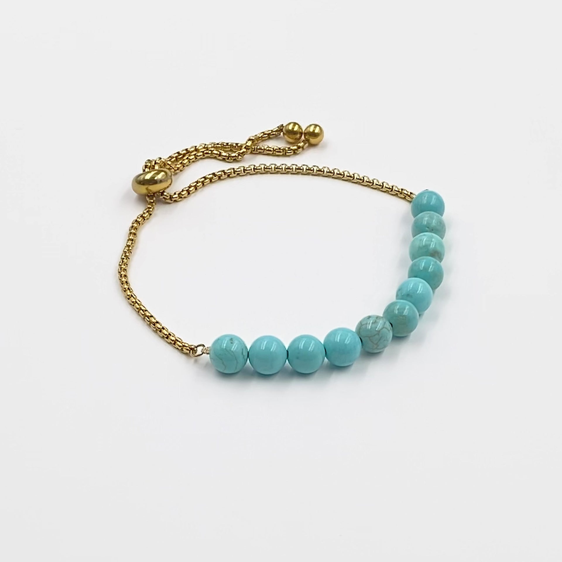 Gold And Light Blue Bolo Sliding Clasp Bolo Sliding Knot Natural Stone Turquoise Hypoallergenic Nickel Free Dainty Adjustable Bracelet. Custom Blue Howlite Raw Natural Stone Accents And Designed With Love In Texas. Size 1 Inch to 9 Inch Circumference With Custom Sizing Available On Select Pieces.