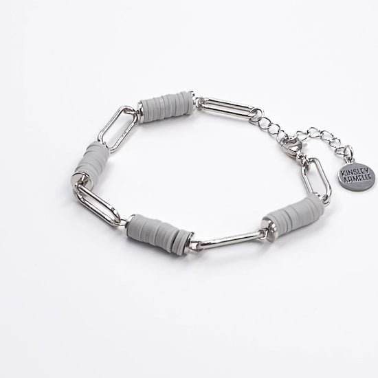 Silver And Gray Clasp Heishi Station Hypoallergenic Nickel Free Adjustable Bracelet. Custom Clay Decorative Accent Beads Accents And Designed With Love In Texas. Size 6.5 - 8 Inch Circumference With Custom Sizing Available On Select Pieces.