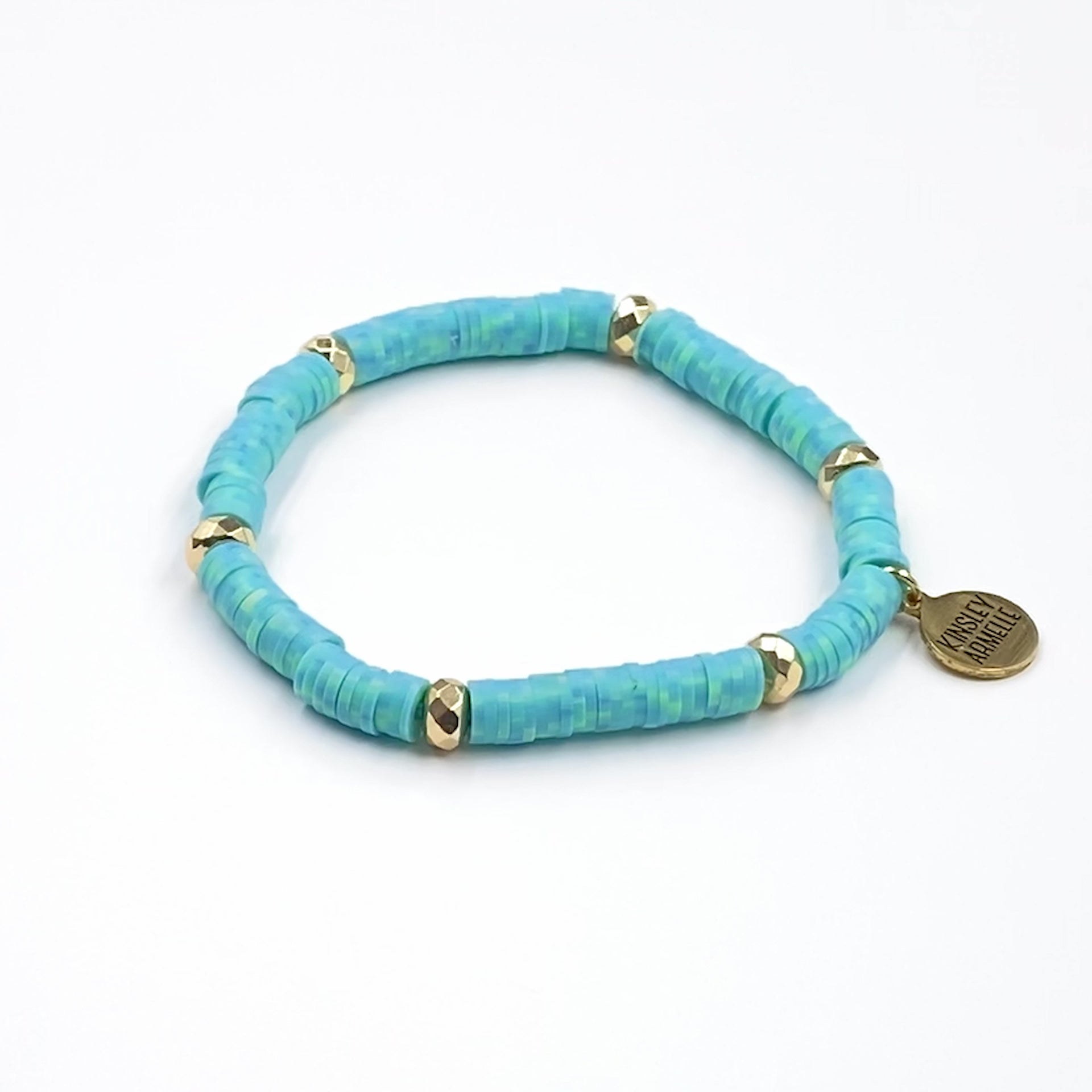 Gold And Light Blue Disc Heishi Station Hypoallergenic Nickel Free Beaded Stretch Bracelet. Custom Decorative Accent Beads Accents And Designed With Love In Texas. Size Small, Medium, Large, and Extra Large Ranging From 6.25 - 7.25 Inch Circumference With Custom Sizing Available On Select Pieces.
