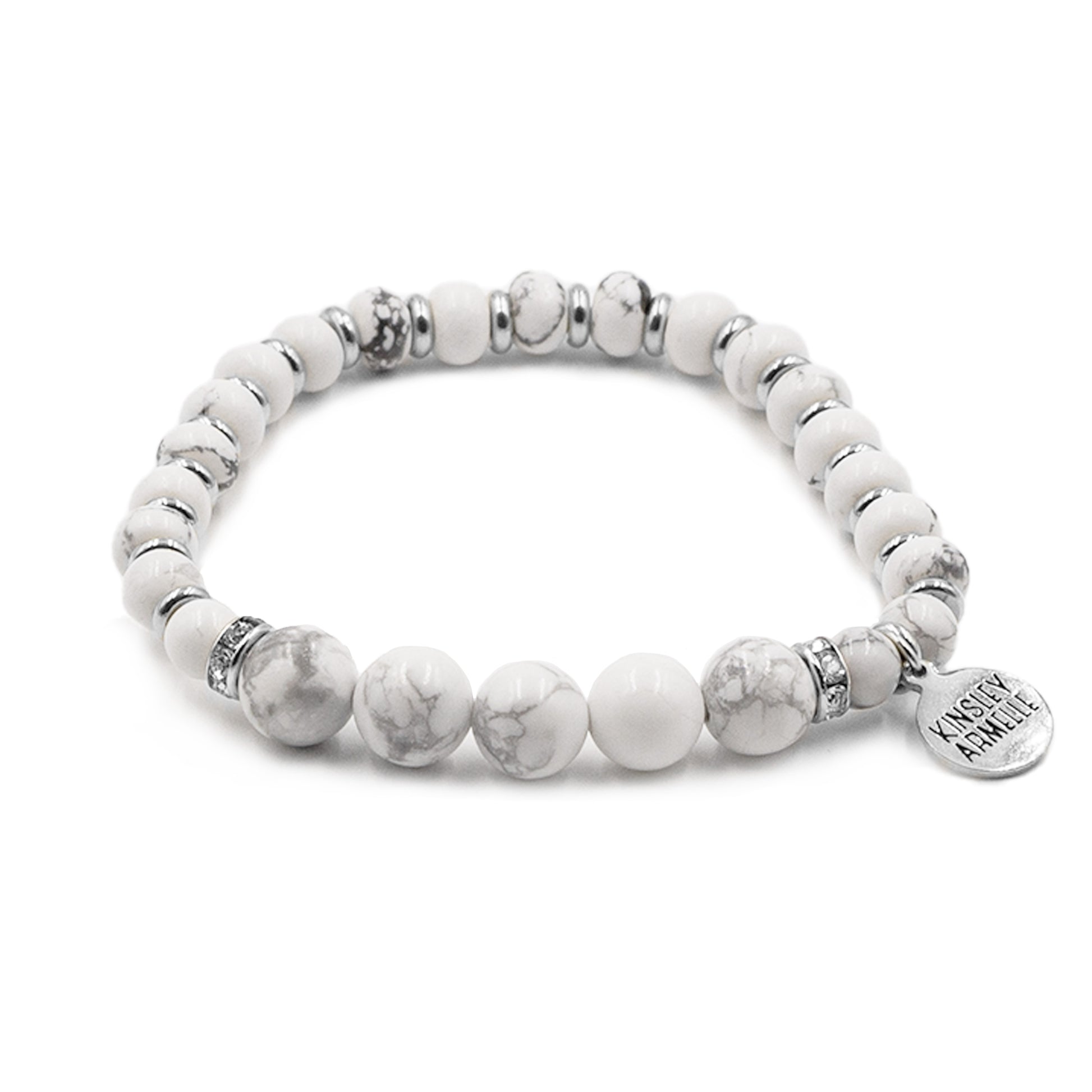 Silver And White Cylindrical Disc Geometric Natural Stone Hypoallergenic Nickel Free Beaded Stretch Bracelet. Custom Howlite Raw Natural Stone Accents And Designed With Love In Texas. Size Small, Medium, Large, and Extra Large Ranging From 6.25 - 7.25 Inch Circumference With Custom Sizing Available On Select Pieces.