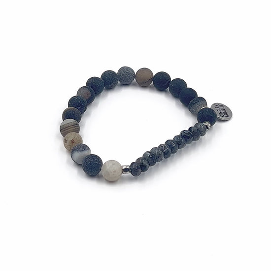 Silver And Black Faceted Gray Marble Hypoallergenic Nickel Free Beaded Stretch Bracelet. Custom Larvikite Raw Natural Stone Accents And Designed With Love In Texas. Size Small, Medium, Large, and Extra Large Ranging From 6.25 - 7.25 Inch Circumference With Custom Sizing Available On Select Pieces.