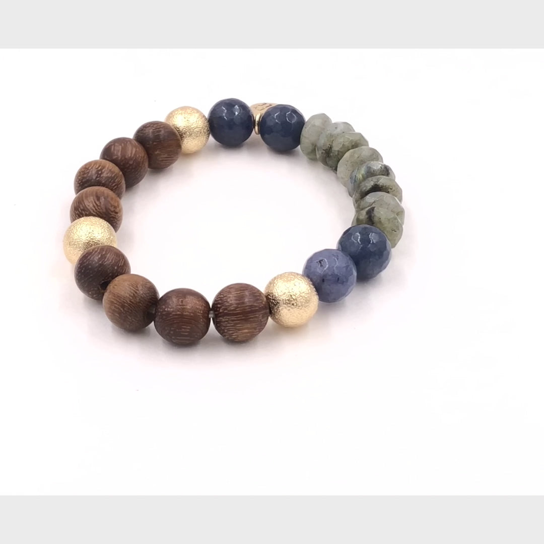 Gold And Brown Asymmetrical Blue Green Natural Stone Wooden Hypoallergenic Nickel Free Beaded Stretch Bracelet. Custom Decorative Accent Beads Accents And Designed With Love In Texas. Size Small, Medium, Large, and Extra Large Ranging From 6.25 - 7.25 Inch Circumference With Custom Sizing Available On Select Pieces.