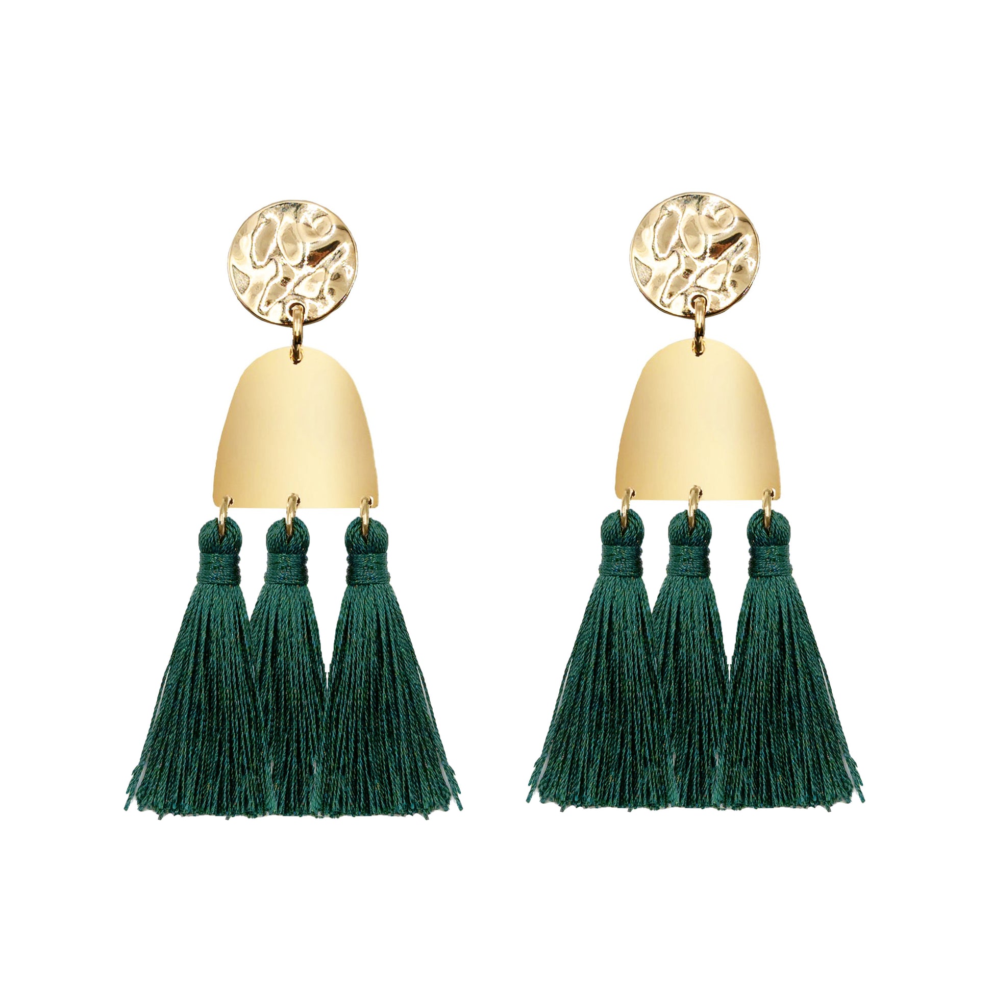 Gold And Green Boho Fringe Rafia Tiered Lightweight Hypoallergenic Nickel Free Statement Drop Earrings. Custom Linen Tassels Accents And Designed With Love In Texas. Size 2.75 Inch Length x 0.75 Inch Width With Custom Sizing Available On Select Pieces.