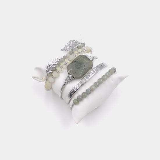 Silver And Green Bolo Sliding Clasp Bolo Sliding Knot Cubed Cuff Engraved Iridescent Leaf Feather Natural Stone Stackable Wire Wrapped Hypoallergenic Nickel Free Bracelet Stack Set. Custom Labradorite Raw Natural Stone Accents And Designed With Love In Texas. Size Small, Medium, Large, and Extra Large Ranging From 6.25 - 7.25 Inch Circumference With Custom Sizing Available On Select Pieces.