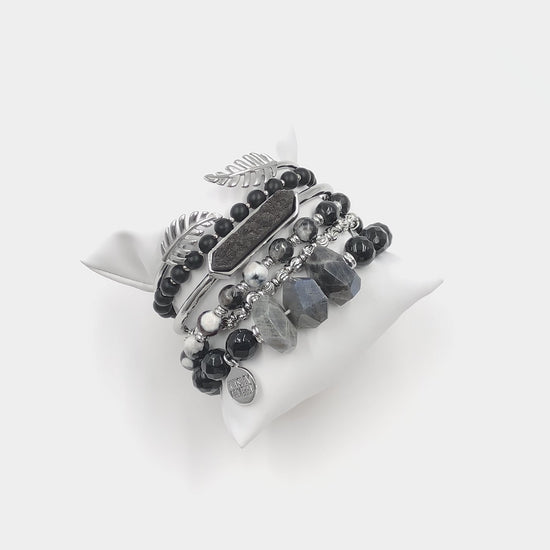 Silver And Black Beads Cuff Leaf Feather Natural Stone Nugget Raw Wrap Hypoallergenic Nickel Free Bracelet Stack Set. Custom Druzy Raw Natural Quartz Stone Accents And Designed With Love In Texas. Size Small, Medium, Large, and Extra Large Ranging From 6.25 - 7.25 Inch Circumference With Custom Sizing Available On Select Pieces.