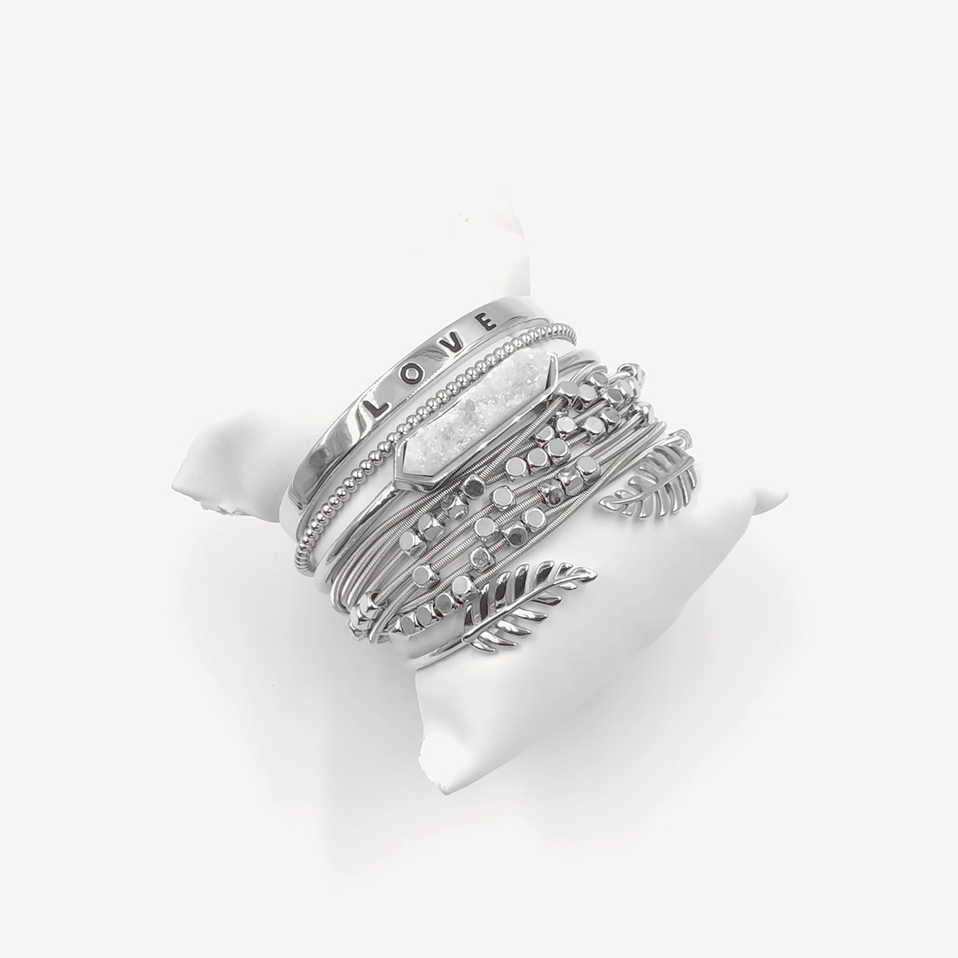 Silver And Gray Cuff Engraved Leaf Feather Multistrand Stackable Hypoallergenic Nickel Free Bracelet Stack Set. Custom Druzy Raw Natural Quartz Stone Accents And Designed With Love In Texas. Size Small, Medium, Large, and Extra Large Ranging From 6.25 - 7.25 Inch Circumference With Custom Sizing Available On Select Pieces.