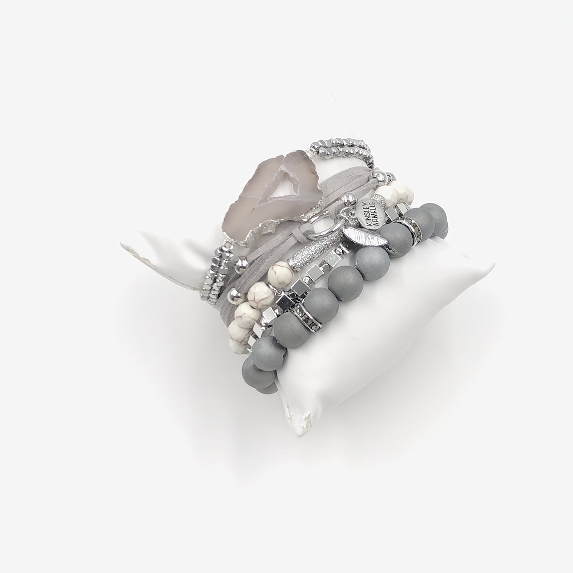 Silver And Gray Adjustable Beads Geode Pocks Magnetic Pave Wrap Hypoallergenic Nickel Free Bracelet Stack Set. Custom Agate Slices Raw Natural Stone Accents And Designed With Love In Texas. Size Small, Medium, Large, and Extra Large Ranging From 6.25 - 7.25 Inch Circumference With Custom Sizing Available On Select Pieces.