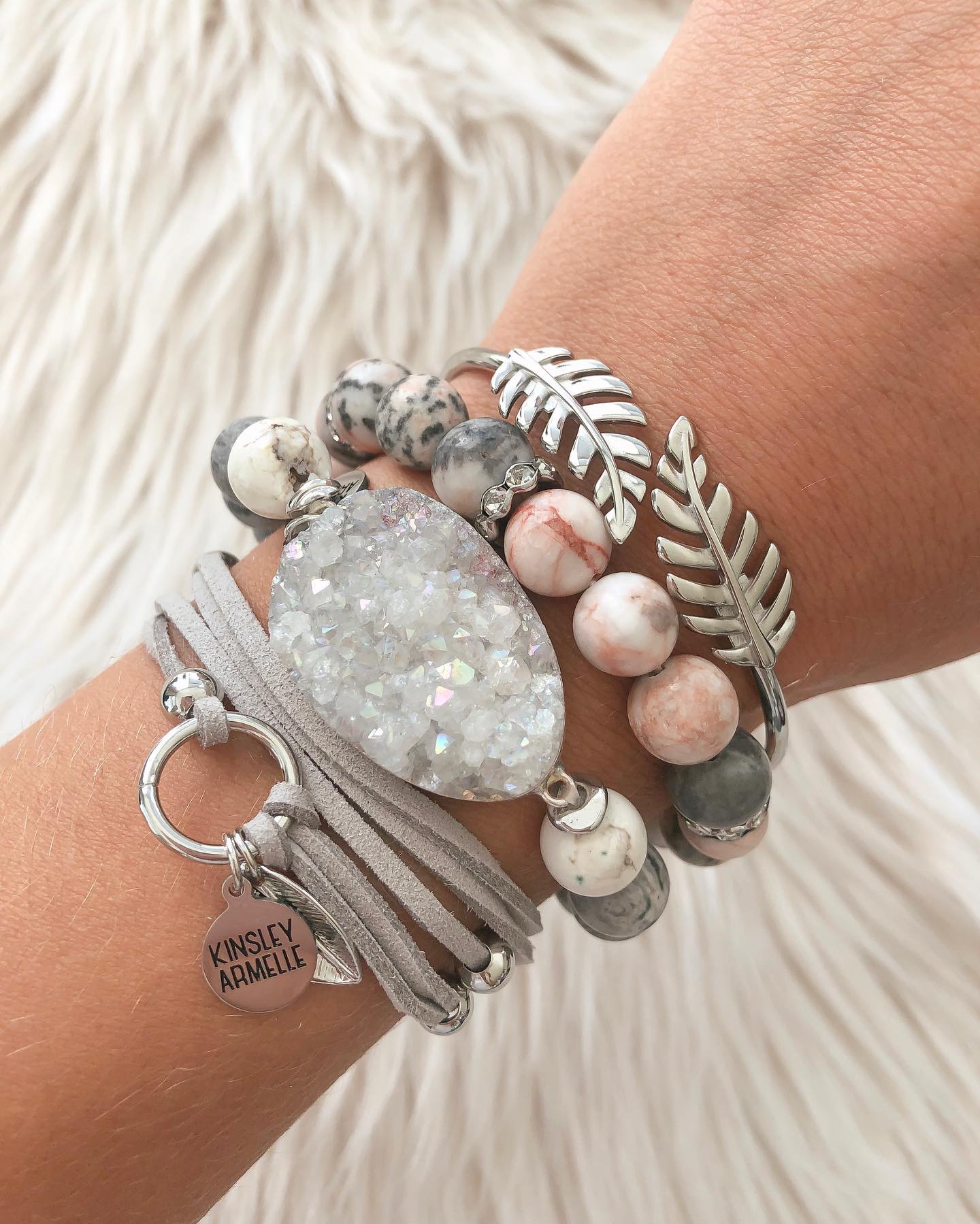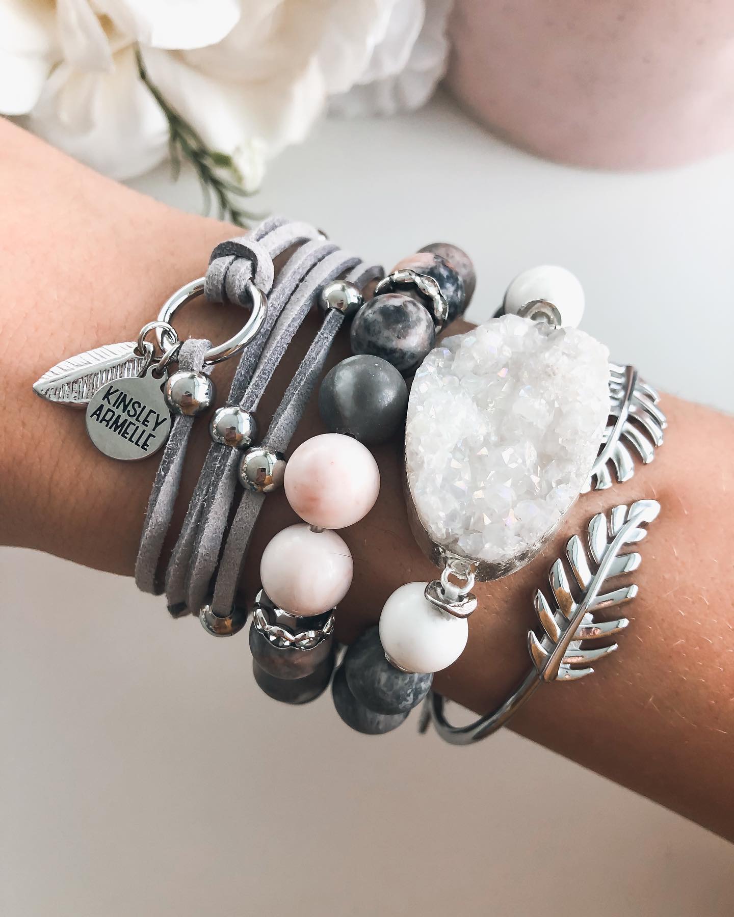 Silver And Pink Druzy Leaf Feather Magnetic Natural Stone Crystal Gemstone Raw Stackable Wrap Hypoallergenic Nickel Free Bracelet Stack Set. Custom Druzy Raw Natural Quartz Stone Accents And Designed With Love In Texas. Size Small, Medium, Large, and Extra Large Ranging From 6.25 - 7.25 Inch Circumference With Custom Sizing Available On Select Pieces.