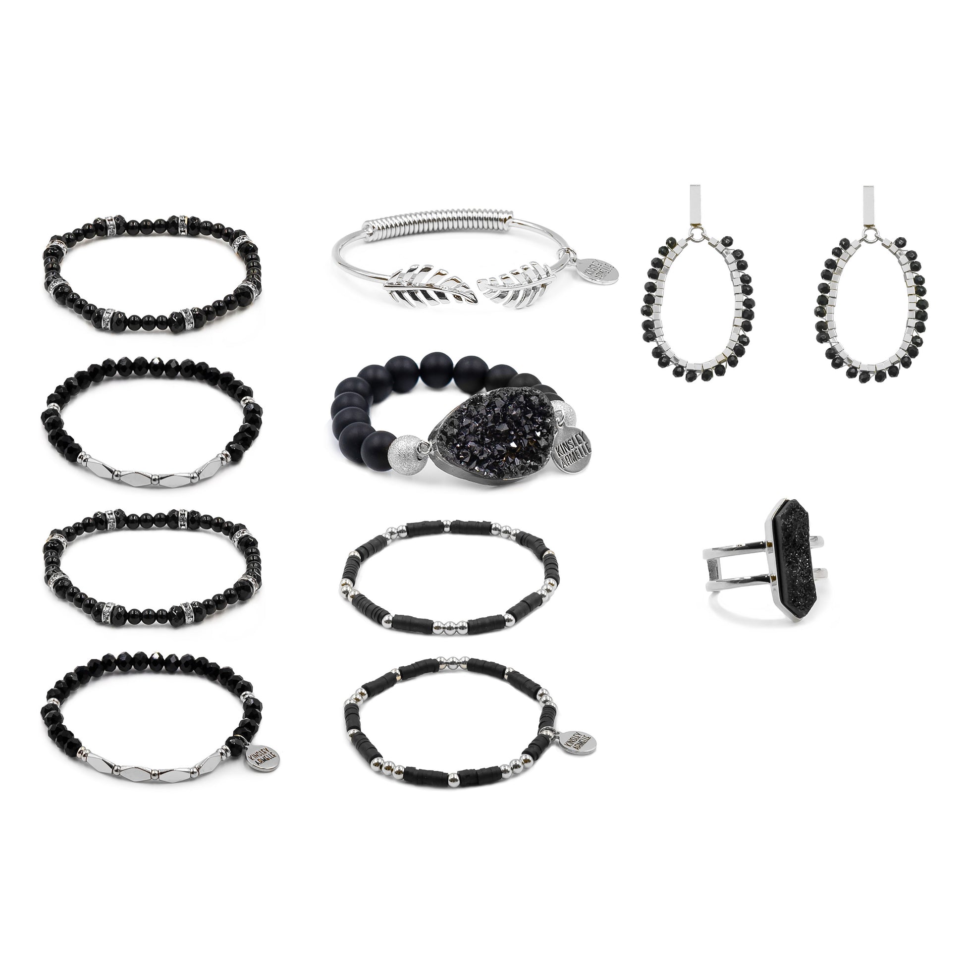 Silver And Black Beads Cuff Disc Earrings Heishi Hypoallergenic Nickel Free Jewelry & Bracelet Stack Set. Custom Druzy Raw Natural Quartz Stone Accents And Designed With Love In Texas. Size Small, Medium, Large, and Extra Large Ranging From Bracelets: 6.25 - 7.25 Inch Circumference | Earrings: 2.5 Inches Length x 1.5 Inches Width | Ring: 7 or 8 With Custom Sizing Available On Select Pieces.