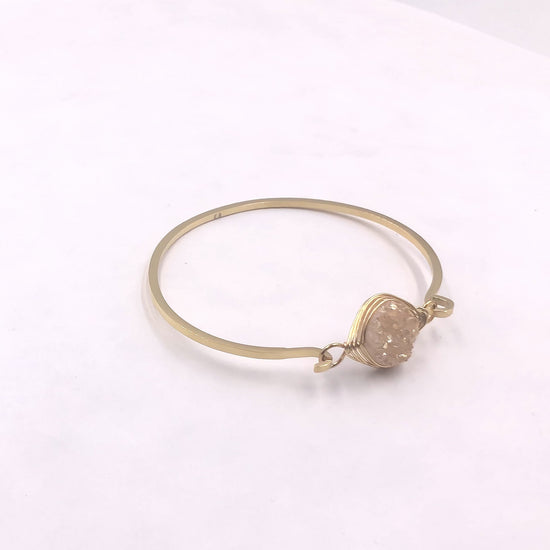 Gold And Brown Wire Wrapped Hypoallergenic Nickel Free Bangle Cuff Bracelet. Custom Druzy Raw Natural Quartz Stone Accents And Designed With Love In Texas. Size Small, Medium, Large, and Extra Large Ranging From 6.25 - 7.25 Inch Circumference With Custom Sizing Available On Select Pieces.