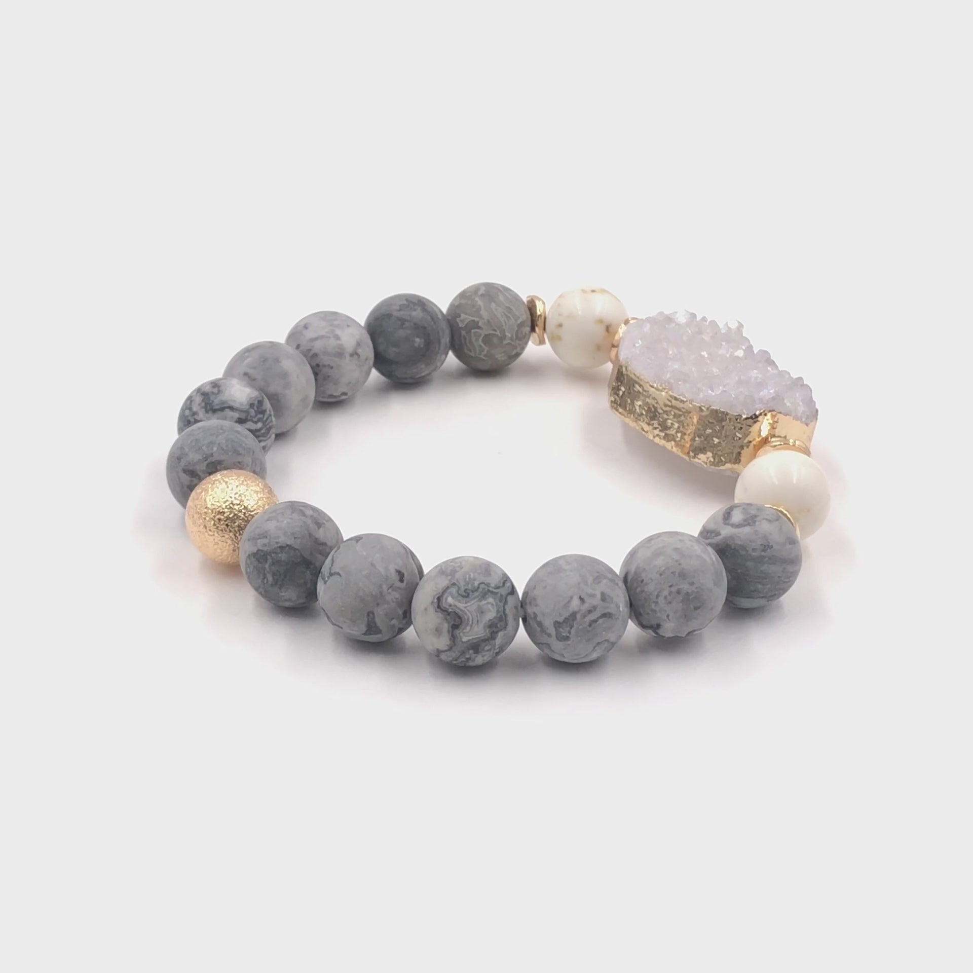 Gold And Gray Marble Hypoallergenic Nickel Free Beaded Stretch Bracelet. Custom Druzy Raw Natural Quartz Stone Accents And Designed With Love In Texas. Size Small, Medium, Large, and Extra Large Ranging From 6.25 - 7.25 Inch Circumference With Custom Sizing Available On Select Pieces.