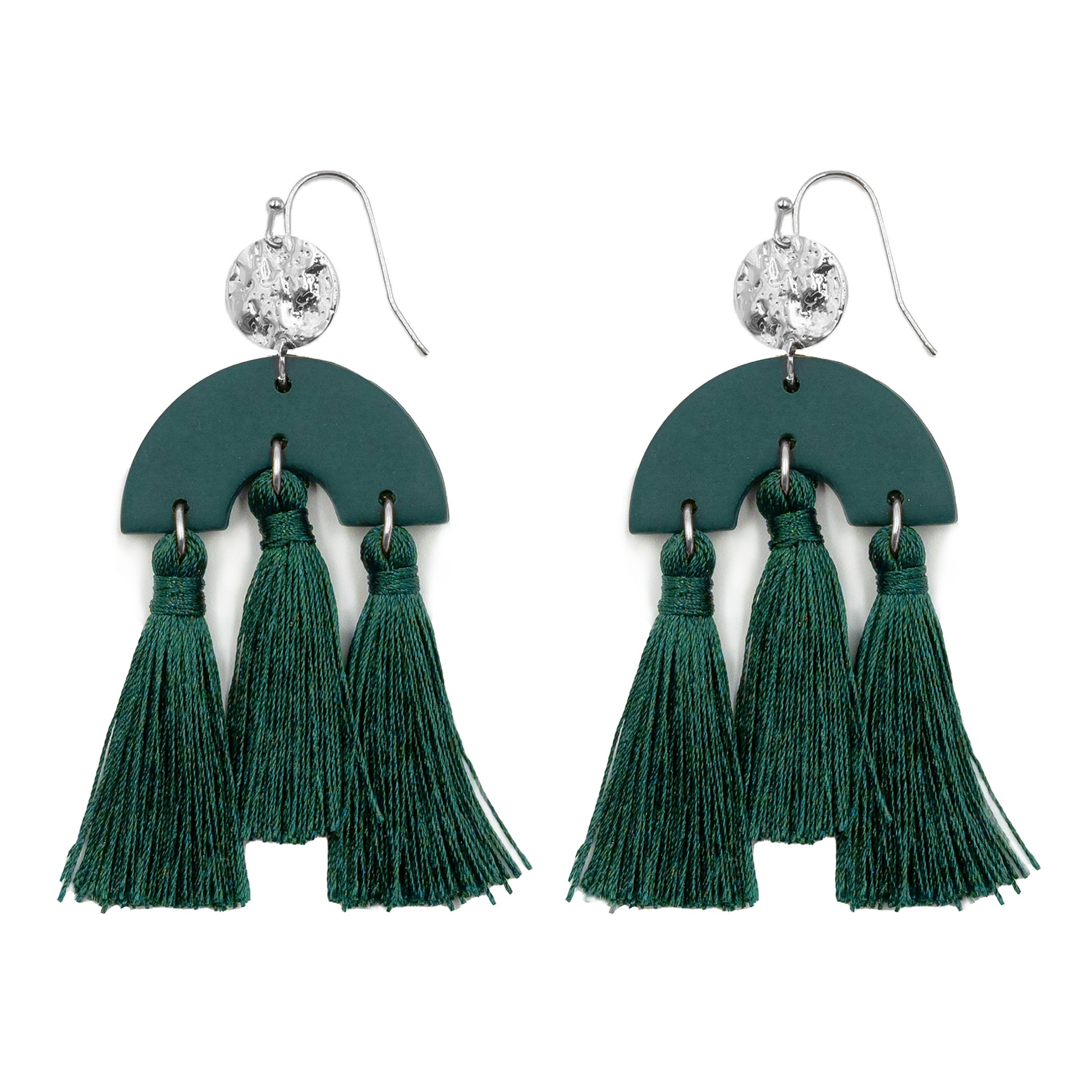 Silver And Green Boho Fringe Rafia Tiered Lightweight Hypoallergenic Nickel Free Statement Drop Earrings. Custom Linen Tassels Accents And Designed With Love In Texas. Size 3 Inches Length x 1.5 Inches Width With Custom Sizing Available On Select Pieces.