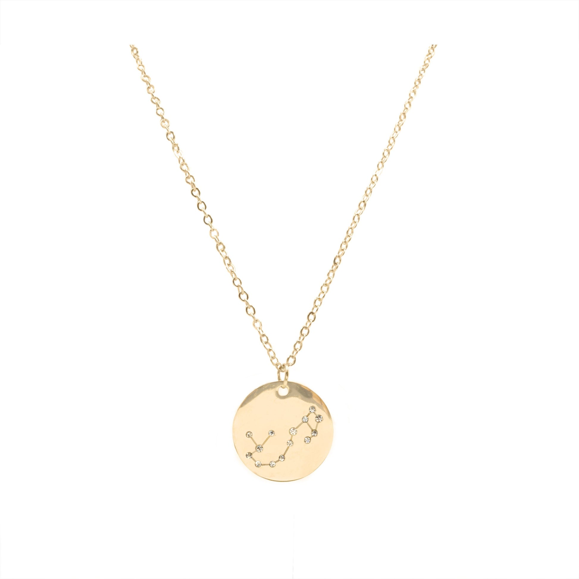 Gold Coin Constellation Astrology Disc Galaxy November October Zodiac Hypoallergenic Nickel Free All Metal Pendant Necklace. Custom Zircon Gemstones Accents And Designed With Love In Texas. Size 18 or 22 Inch Length, Plus 3 Inch Attached Necklace Extender With Custom Sizing Available On Select Pieces.